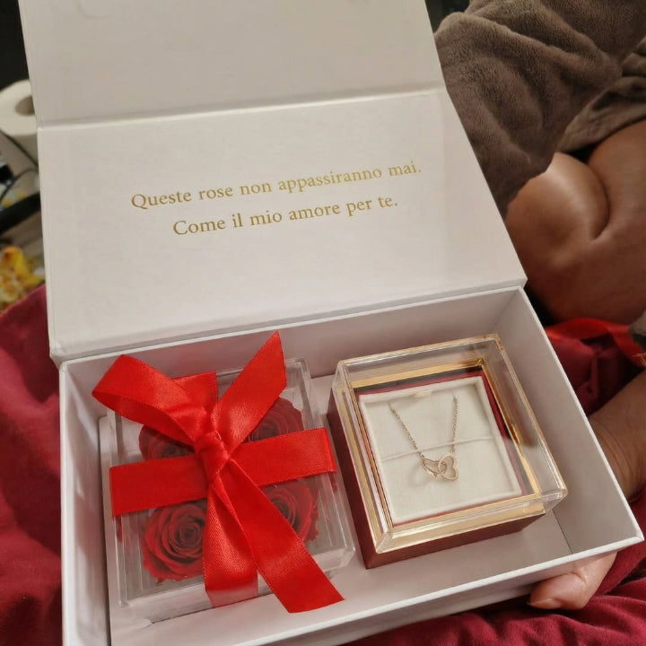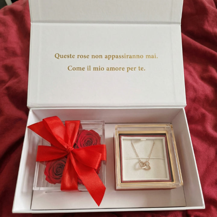 Ogni ordine viene preparato con cura: la rosa vera viene stabilizzata e rifinita a mano, mentre il gioiello viene inciso con precisione per rendere il tuo regalo davvero unico.